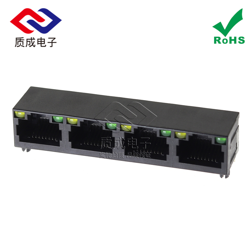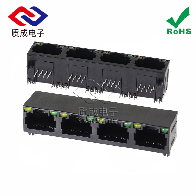 網絡接口連接器RJ45帶LED燈帶殼四口聯排插座 半包帶屏蔽水晶頭