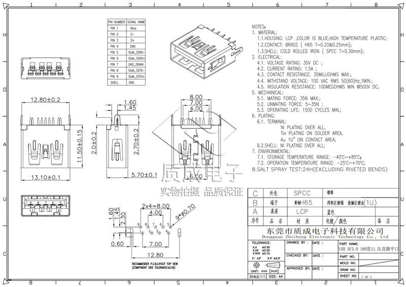 • 型號(hào):USB AF3.0 180度11.5L直腳平口