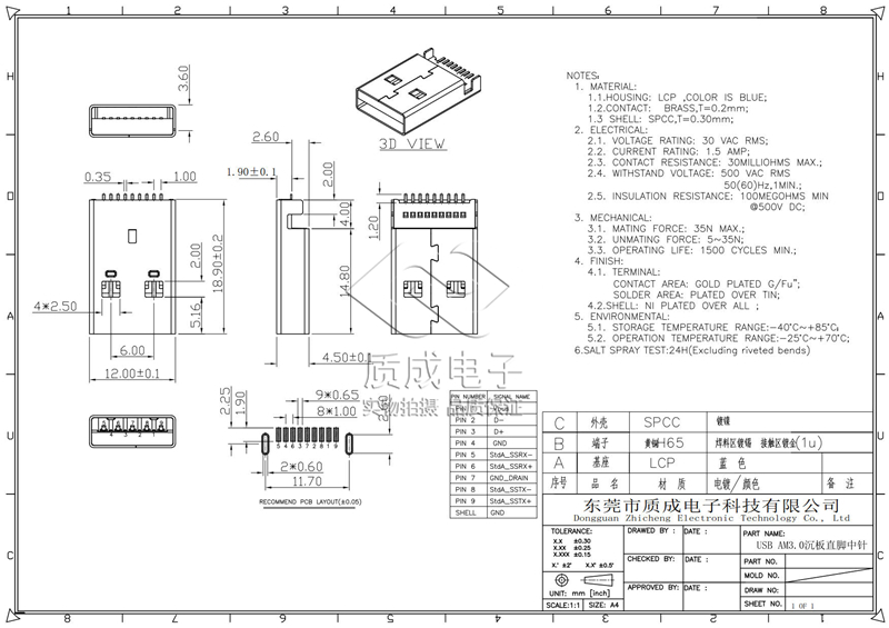• 型號(hào):USB AM3.0沉板直腳中針