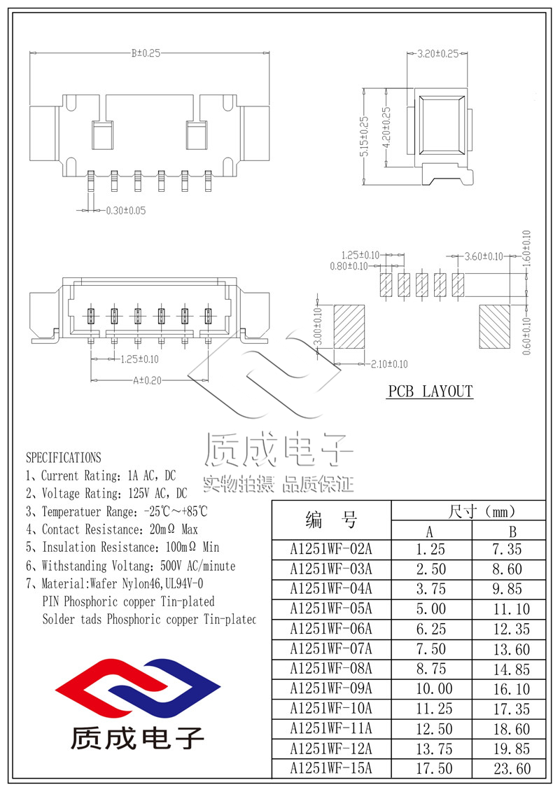 MX1.25-6P臥貼針座1.25-6A米色耐高溫LCP臥式貼片板對(duì)線SMT接插件