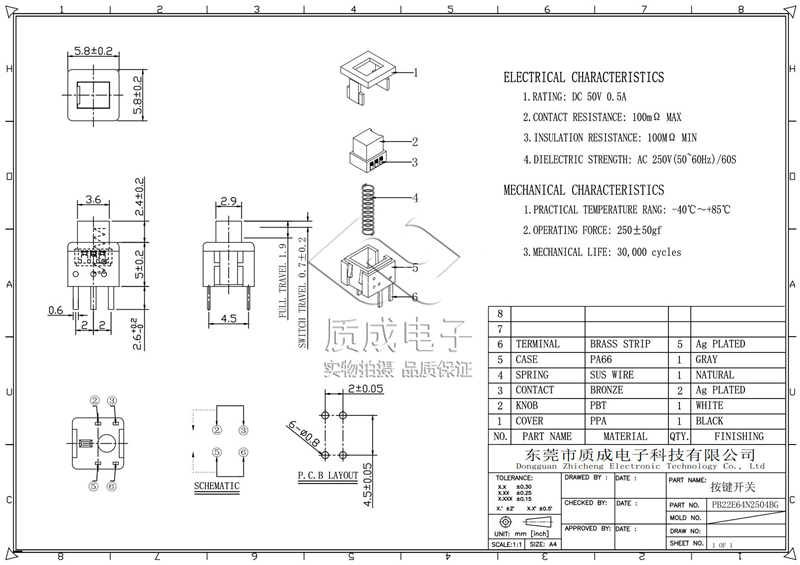 插件自鎖開關(guān)PB-22E6耐高溫PPA白色底座