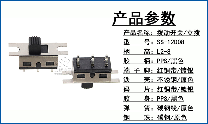 廠家供應SS-12D08立式帶耳撥動開關 柄高L2-8 單排兩檔1P2T大電流