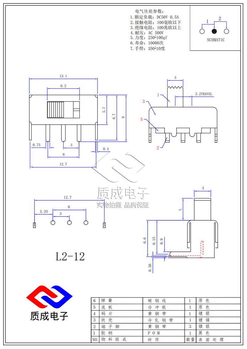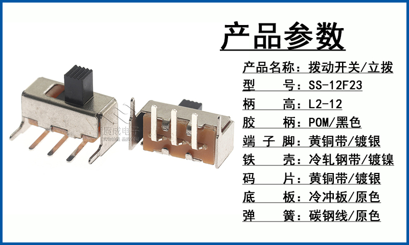廠家供應1P2T撥動開關單排三腳SS-12D10 卷發器電源滑動開關耐溫