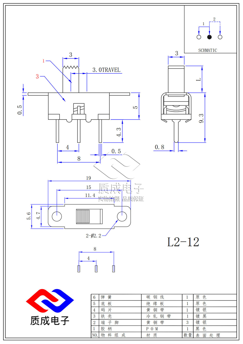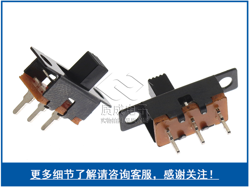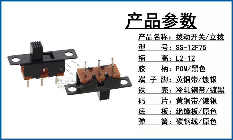 撥動開關單排3腳兩檔SS-12F75立式船型手電筒滑動開關柄高L2-12MM