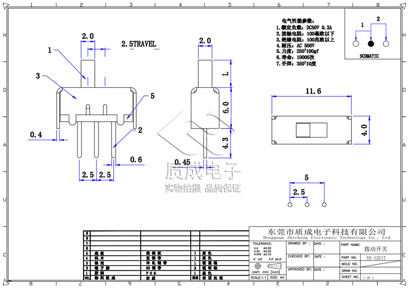 廠家供應1P2T撥動開關單排三腳SS-12D10 卷發(fā)器電源滑動開關耐溫