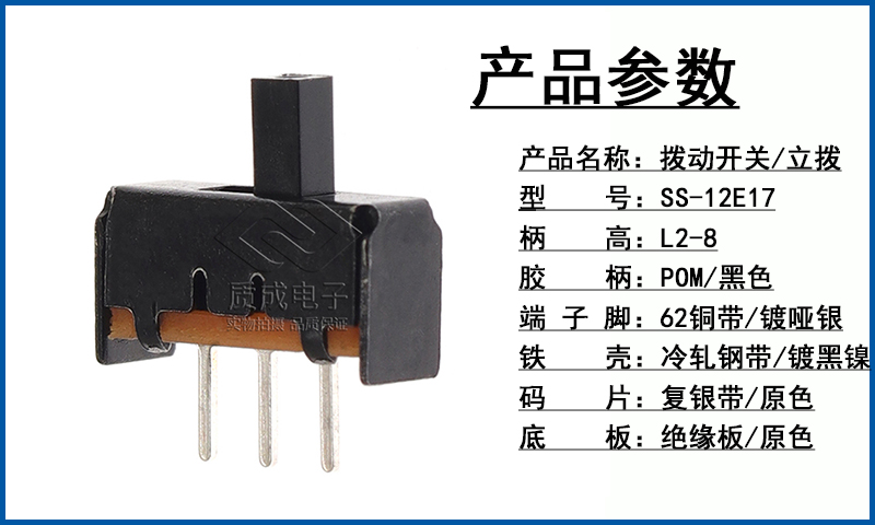 滑動開關黑殼立式插件 SS-12E17單排兩檔三腳 正撥推動玩具開關