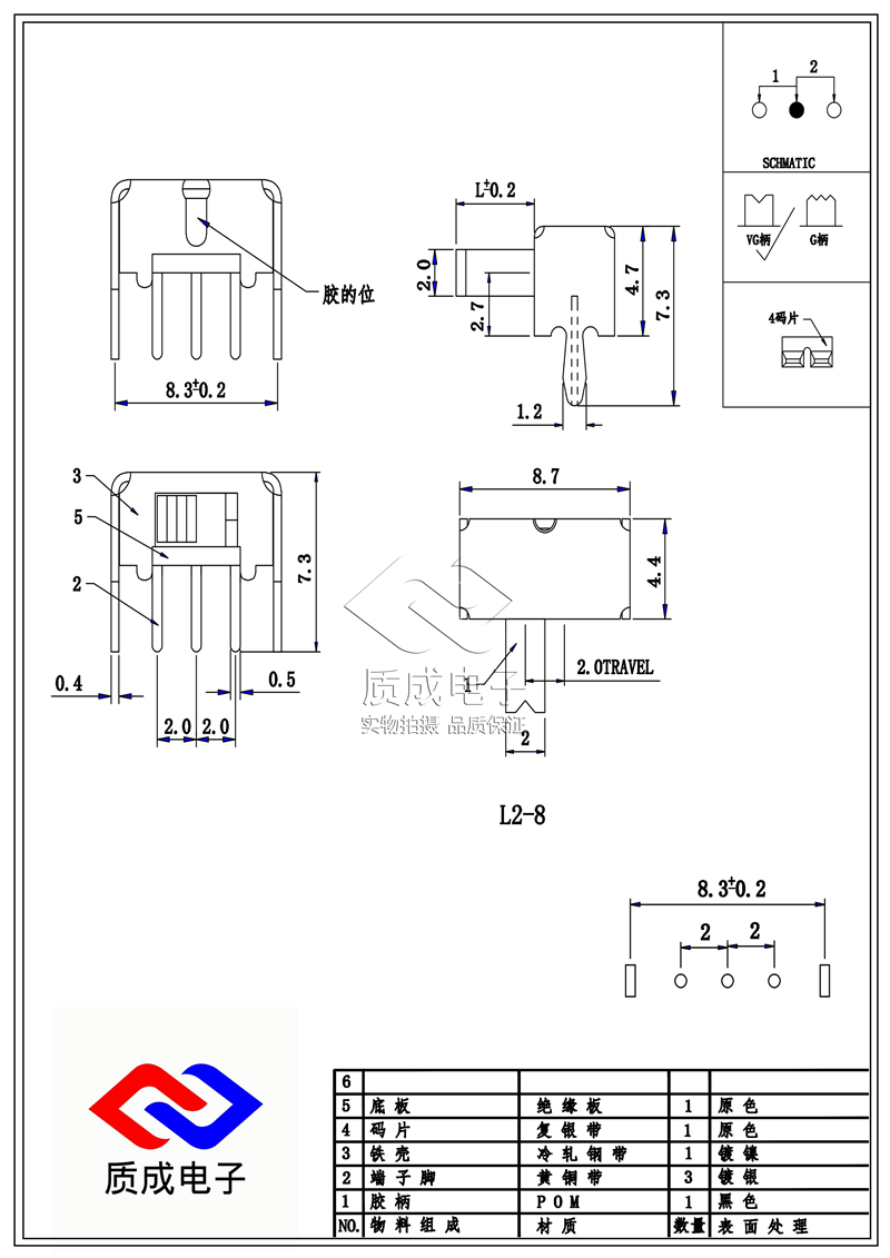 質成撥動開關SK-23D06 側撥雙排三檔藍牙音響滑動開關 柄高L2-8