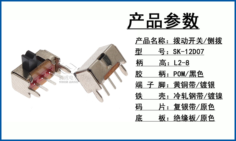 撥動開關SK-12D07臥式三腳插件 柄高2-8 側撥單排兩檔滑動開關
