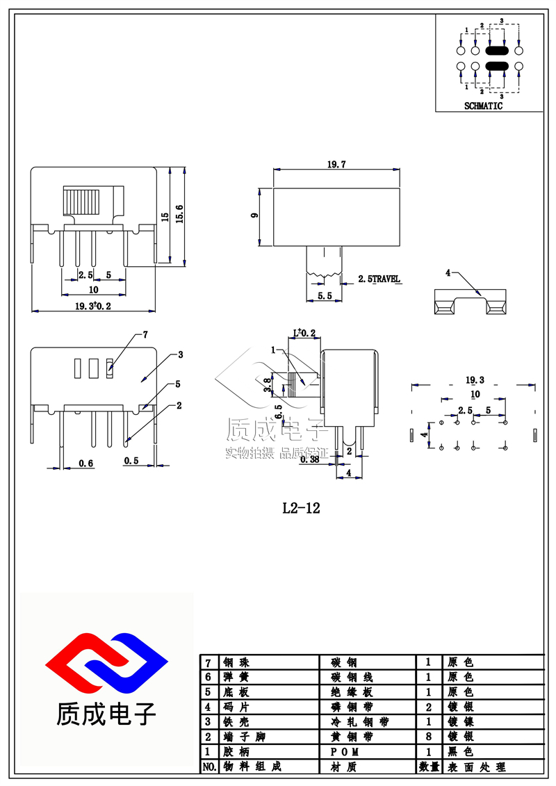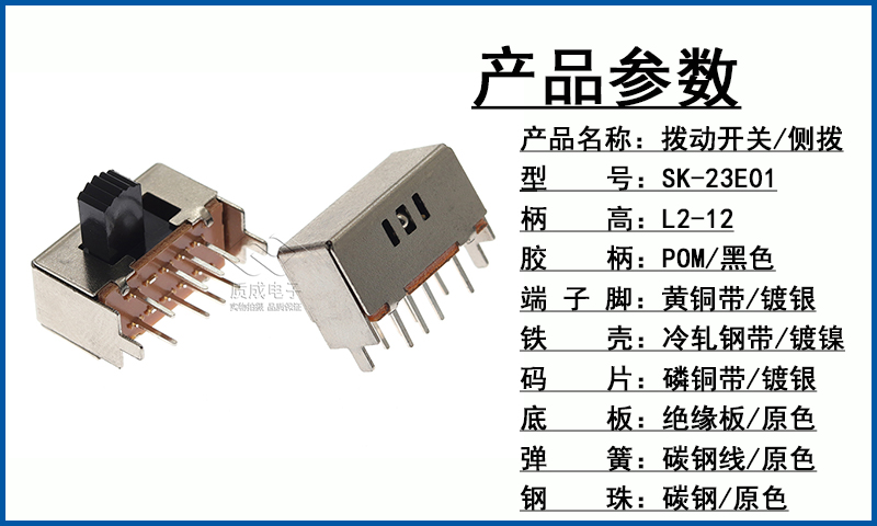 手電筒側撥SK-23E01(2P3T)波段開關 雙排8腳左三右一柄高L2-12