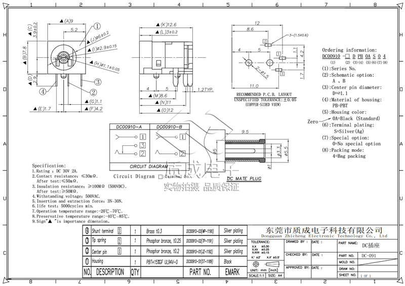 DC-091DC電源插座充電接插口三腳帶柱