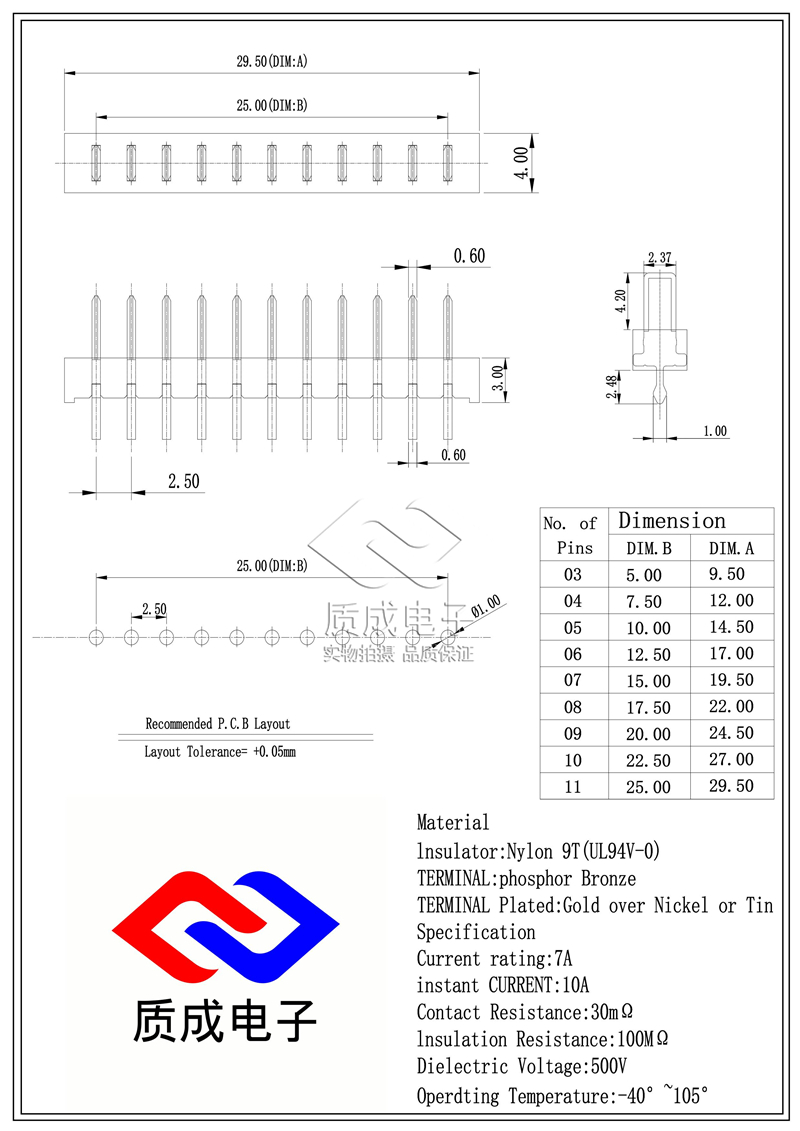 2.5間距刀片電池連接器7P公座 立式直插3-12P大電流醫(yī)療設備插座