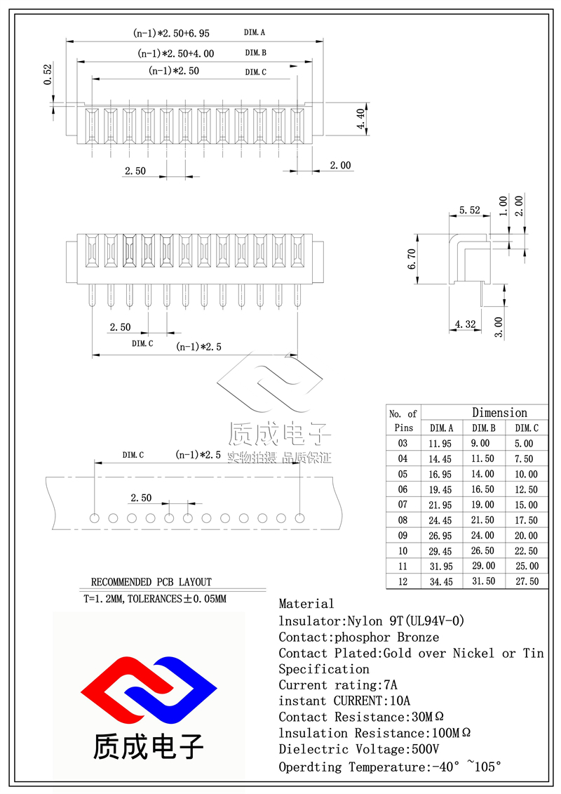 2.5間距母座刀片電池連接器 3-12P燈具照明母座插件鍍金臥式90度