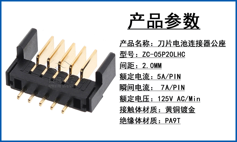 刀片電池連接器公座2.0間距5P直插 ZC-05P20LHC智能門鎖鋰電池