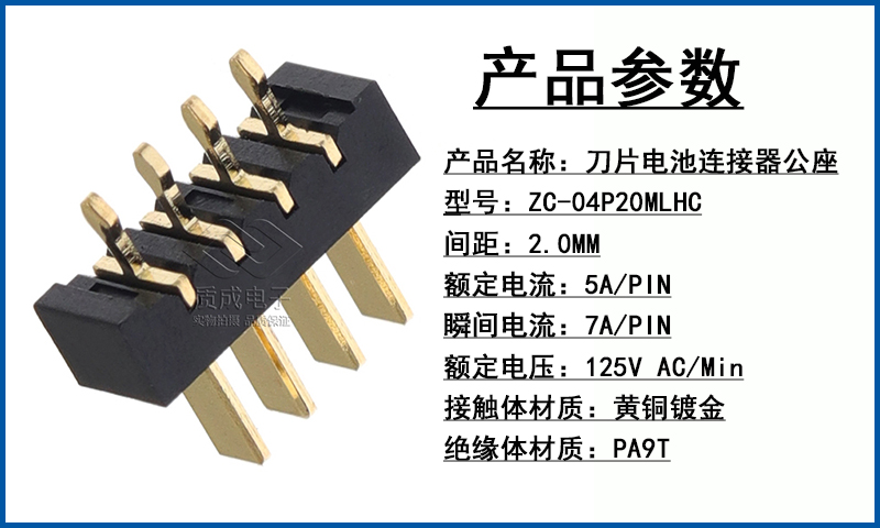 工廠直銷刀片電池連接器公座2.0間距4P直插 ZC-04P20MLHC玩具插座