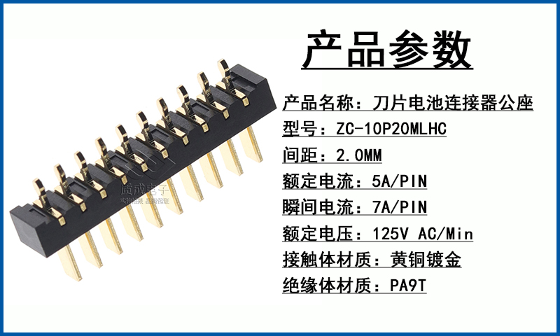 供應2.0間距電池連接器2.0-10P公座直腳 ZC-10P20MLHC大電流