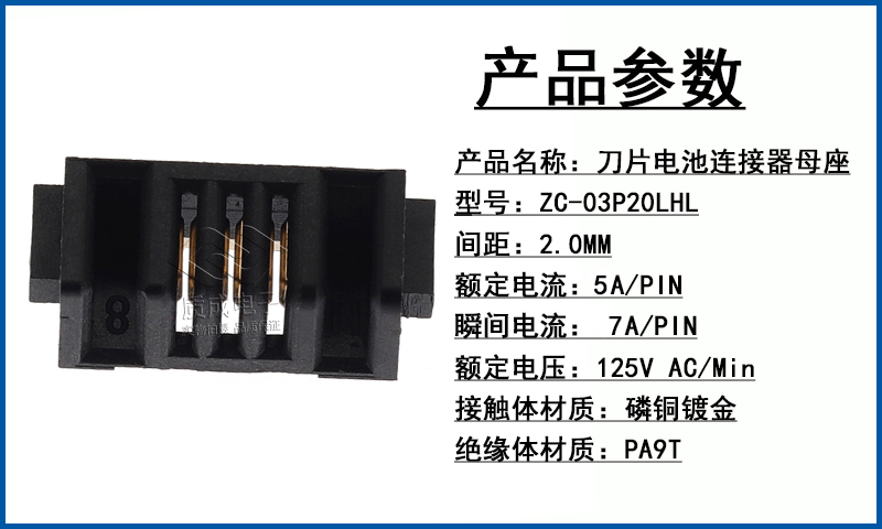電池連接器ZC-03P20MLHL母座 180度插件 2.0mm間距3p刀片式雙彈片