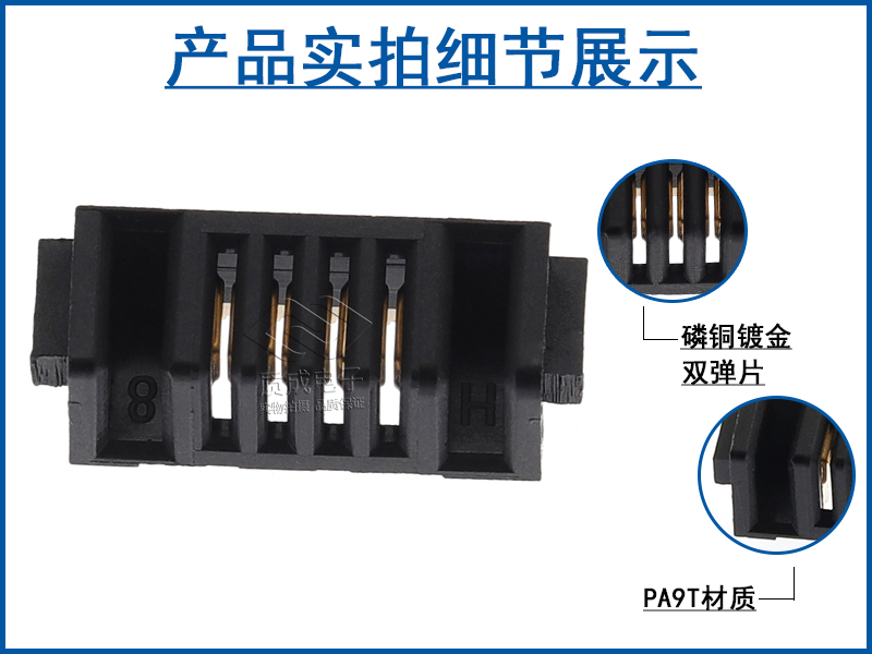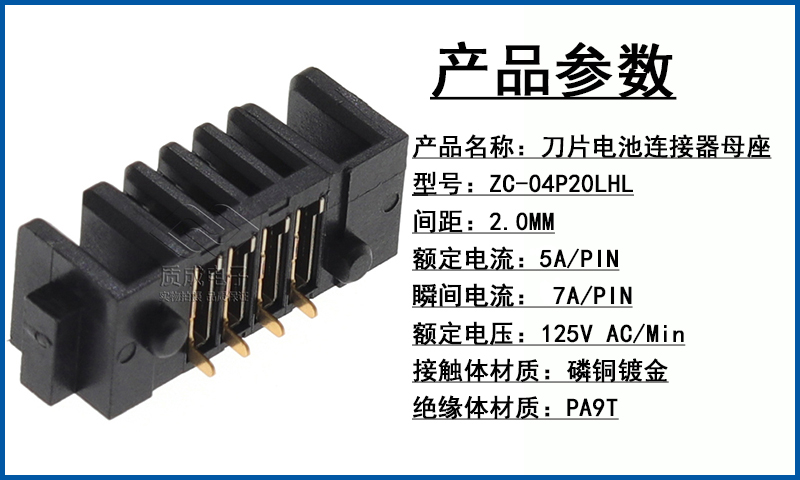刀片式電池連接器2.0間距母座4PIN雙彈片 ZC-04P20LHL鍍金耐溫