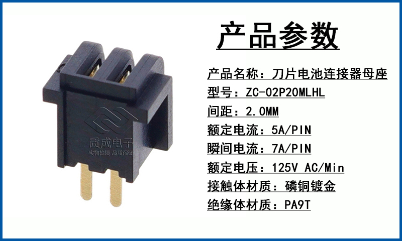 刀片式板對板電池連接器ZC-02P20MLHL間距2.0mm母座180度插件矩形