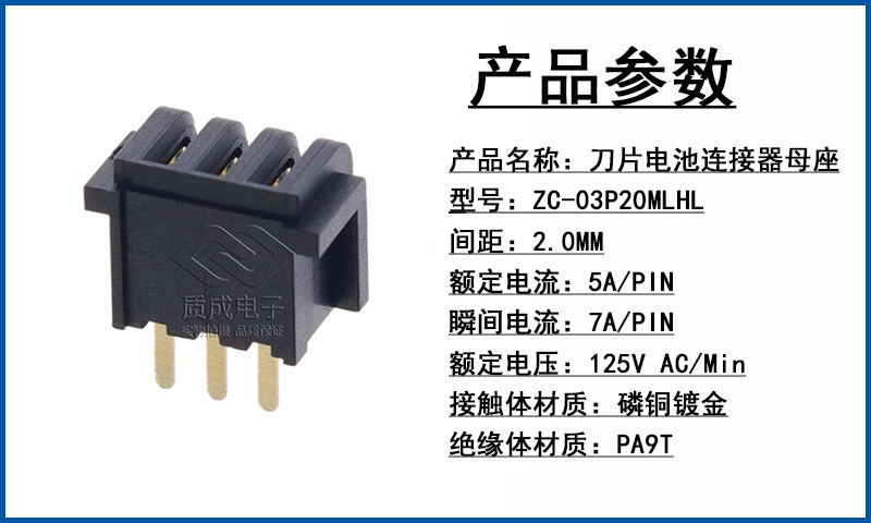 電池連接器ZC-03P20MLHL母座 180度插件 2.0mm間距3p刀片式雙彈片