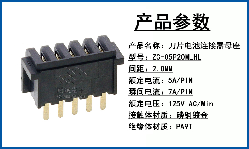 智能門鎖電池連接器母座ZC-05P20MLHL 刀片式2.0間距5P板對板直插