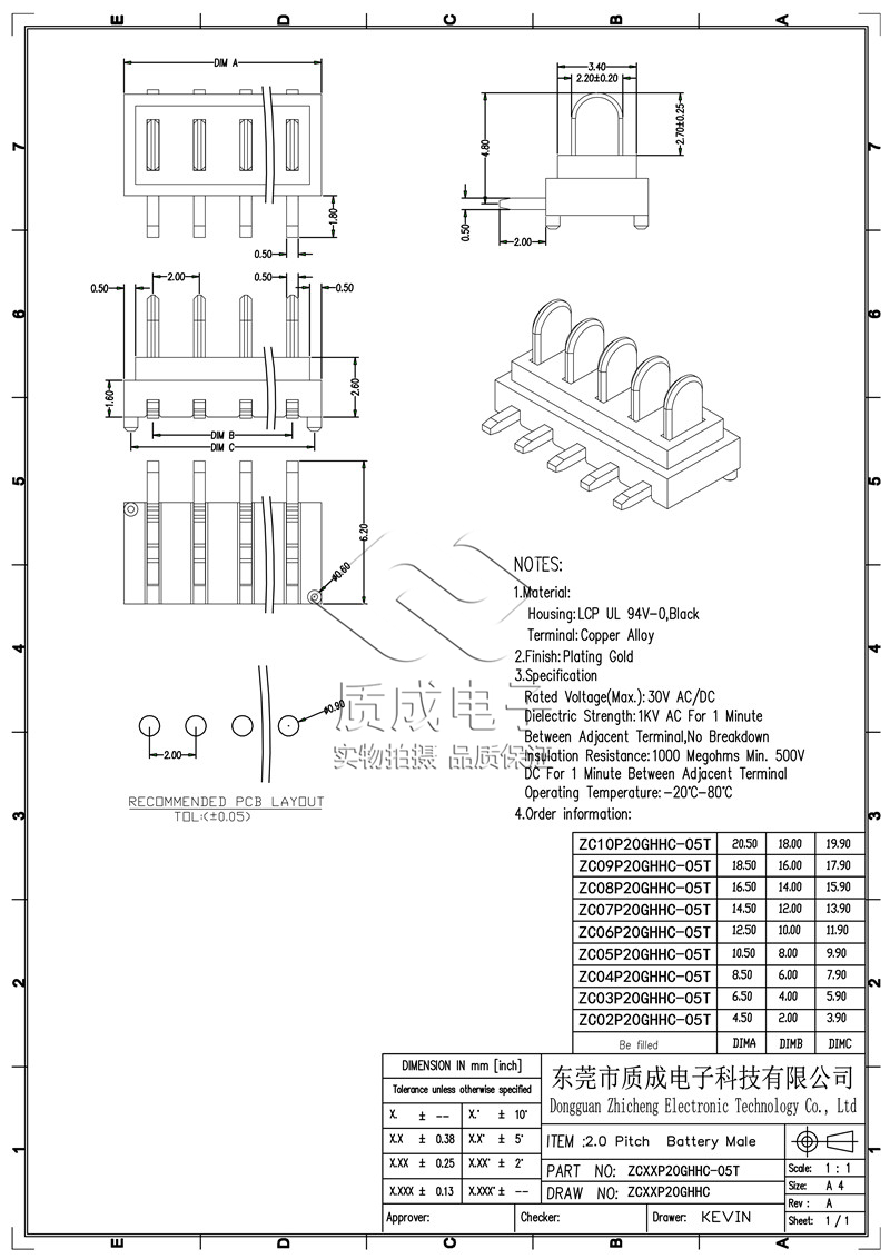 2.0間距刀片式電池連接器5P公座90度小型玩具航模電源鍍金接插件