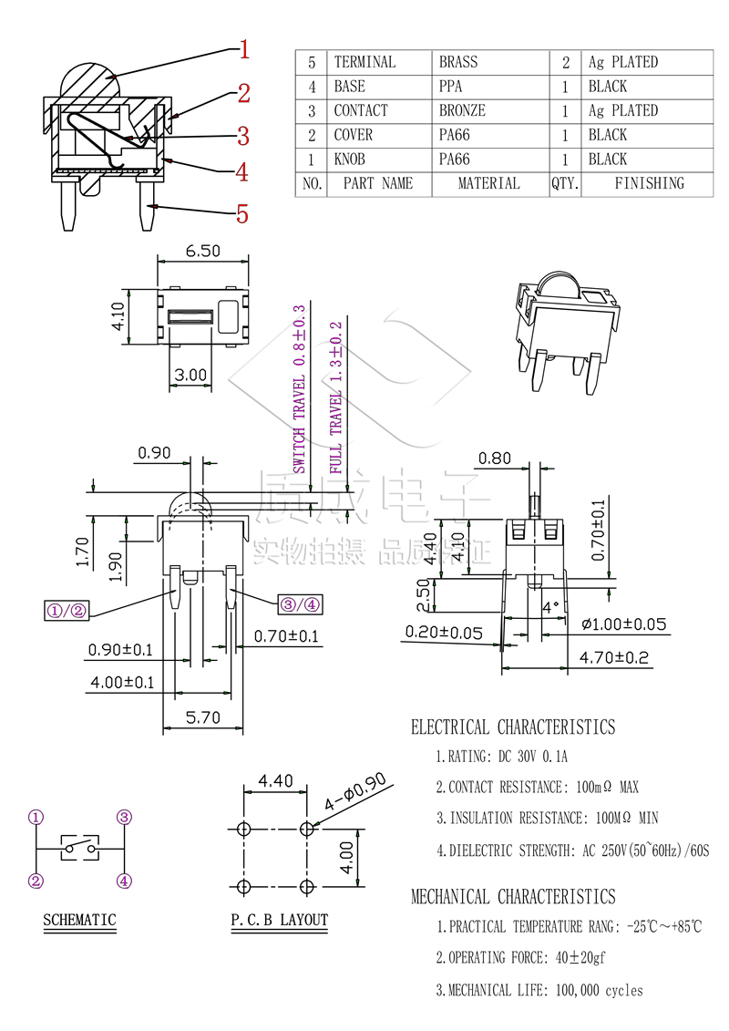 微型四腳貼片補水儀推動檢測開關有柱小按鍵限位開關鍍金