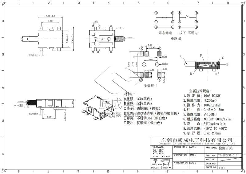 常閉貼片側按六腳復位檢測開關無聲烏龜輕觸按鍵開關TD-1624SA-01B