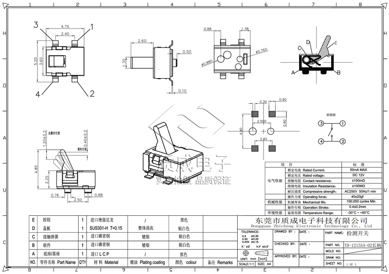 立式四腳貼片檢測開關加長手柄小型復位行程開關TD-1215SA-02長柄