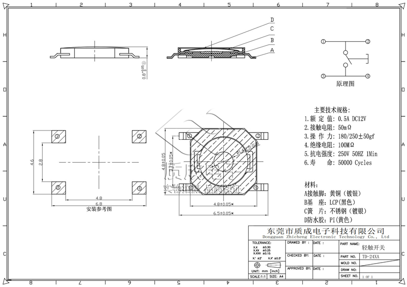 行車記錄儀四腳微型中龜側(cè)按鍵輕觸開關(guān)無柱帶黃膜 耐高溫
