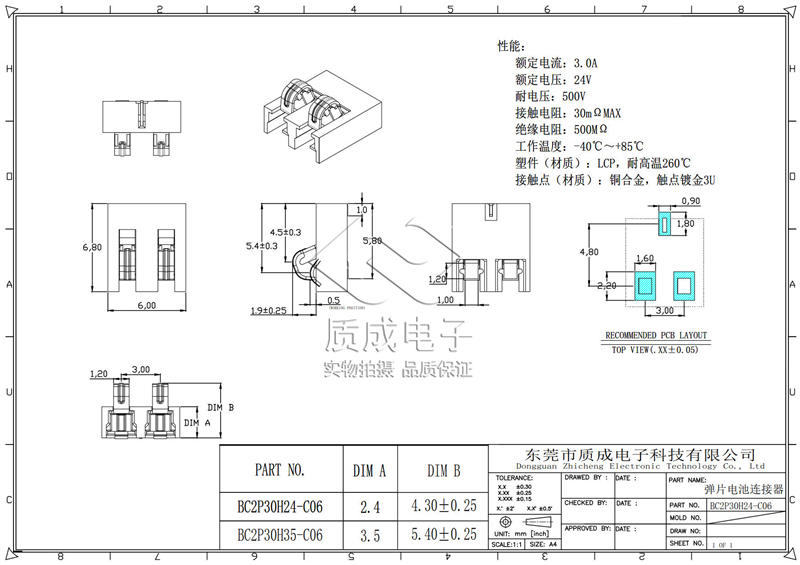 4P側(cè)壓外焊彈片電池座3.0間距塑高4.6 智能兒童玩具電池接口連接器