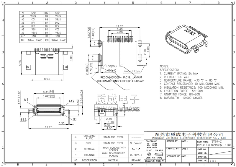• 型號:TYPE-C 2.0 16PIN沉板1.6 3MD