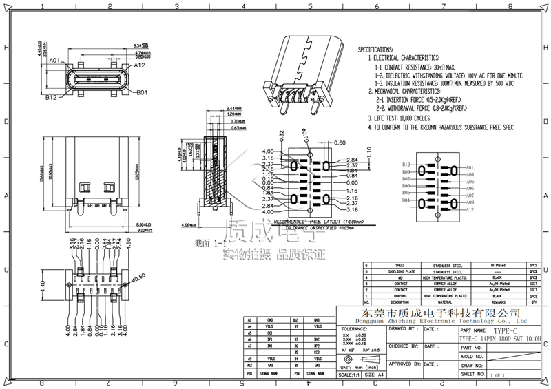 • 型號:TYPE-C 14PIN 180D SMT 10.0H