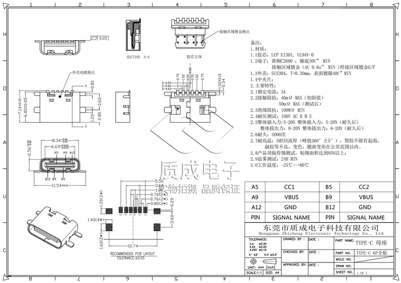 TYPE-C連接器6PIN單排臥式板上四腳固定全貼SMT 大電流快充母座
