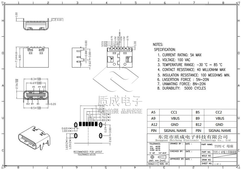 TYPE-C母座6PIN立式貼板5.1mm加蓋SMT不漏舌 大電流