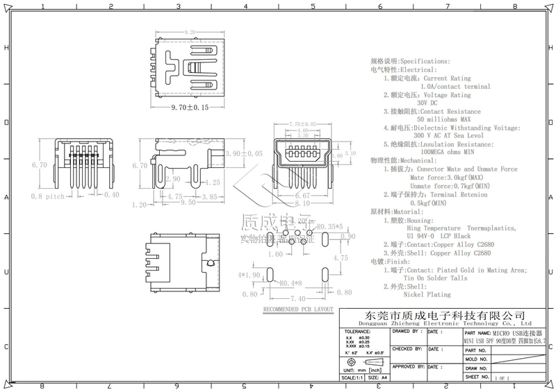 MICRO USB母座 5P B型180度插板腳長(zhǎng)1.5卷邊防塵蓋