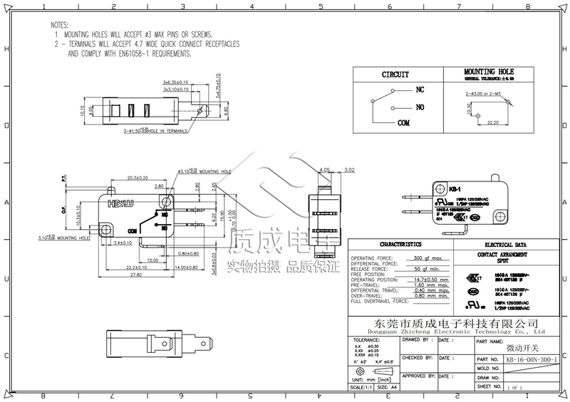 大微動開關自動售賣機微動開關三腳行程限位大電流微動開關 KB-16-00N-300-1