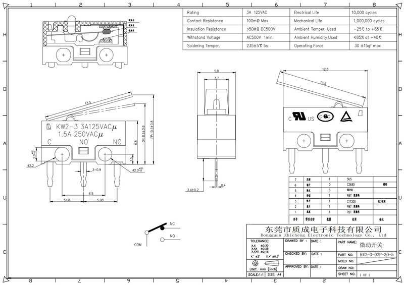 短柄小型三腳微動開關(guān)碎紙機微動限位開關(guān)高壽命KW2-2-05P-30-3